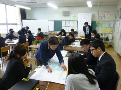 授業後には、参観された教師と本校の教師がグループごとに分かれて、本時の手立てについて、その成果について話し合いました。