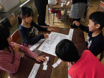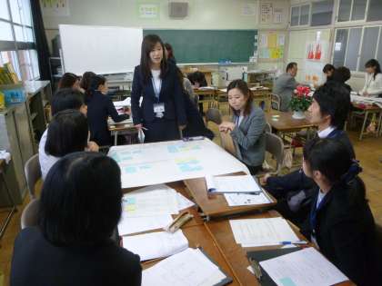 授業後には、参観された教師と本校の教師がグループごとに分かれて、本時の手立てについて、その成果について話し合いました。