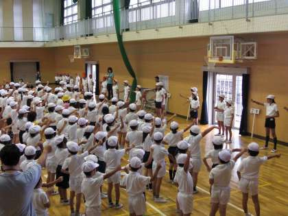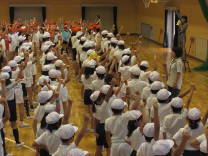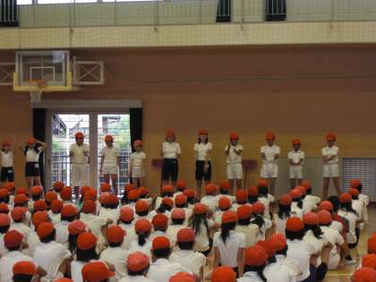 1時間目は、運動会の全校練習を行いました。あいにくの雨で、屋内運動場で行いました。前半は、運動会の歌と校歌の練習をしました。後半は、応援の練習をしました。応援の練習では、応援のやり方を覚え、応援歌の練習をしました。運動会当日、赤白それぞれの応援が楽しみです。