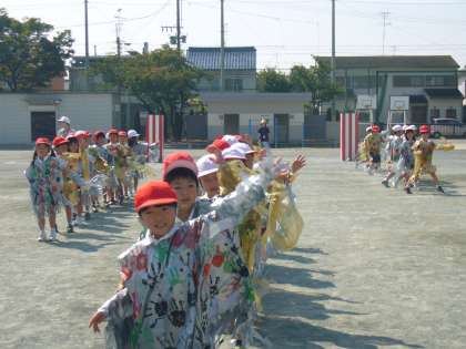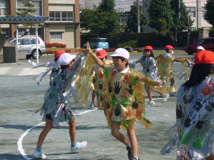 2時間目、本番と同様に自分の手形をつけた衣装をつけて踊りました。暑い日差しの中、音楽に合わせて元気いっぱい踊ることができました。