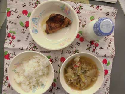 にぎす団子汁 てり鶏 ご飯 牛乳