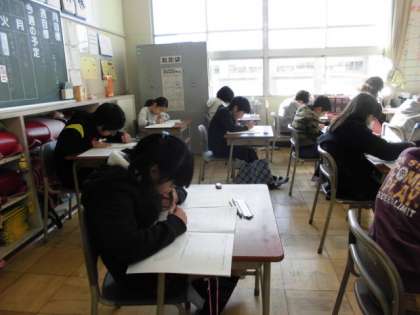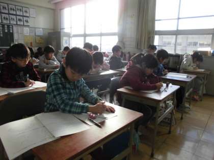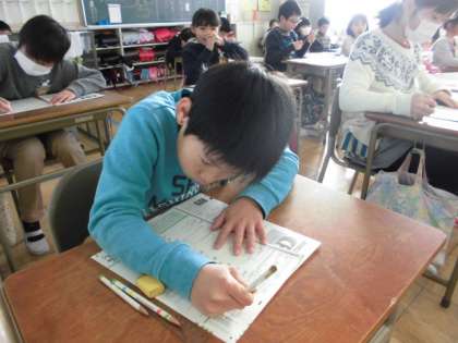 4年生の様子です。算数の学力テストを受けています。一生懸命考えて問題を解いています。