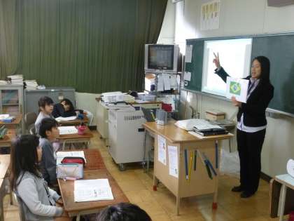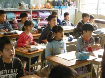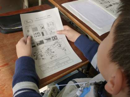 英語活動では、国旗を見てその国の名前を英語で言う練習をしました。普段、言っている国名でも、英語で言うと感じが違っていることに驚いているようでしたが、すぐに正しい発音で言えるようになりました。