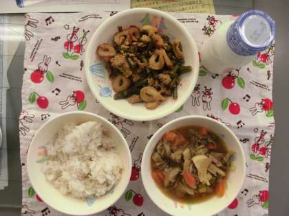 牛丼 いんげんのちくわみそ炒め ご飯 牛乳