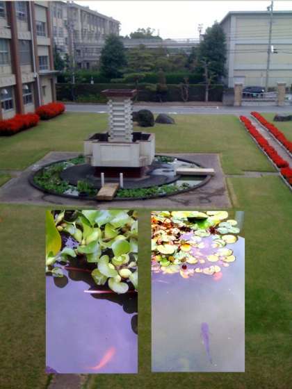 向山小学校の「希望の泉」の芝生まわりも、赤いじゅうたんが広げられたようです。