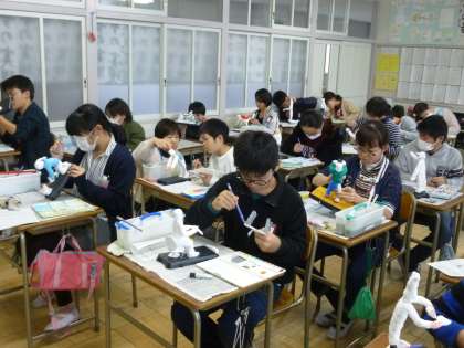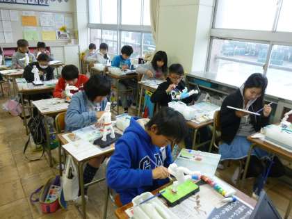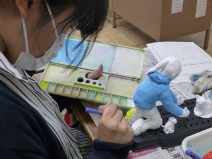 粘土で将来やってみたいことを表しました。今日は、色を付けていきました。鮮やかな色になるよう、水を少なくして、濃いめに塗るよう指導しました。