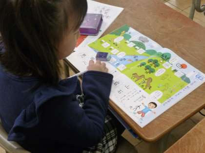 書写では、「なんの形からできた漢字かな」というところの学習を進めました。「馬」や「岩」、「雪」や「雲」など、動物や天候などの様子から考えて、それらの漢字が作られたことを理解させました。