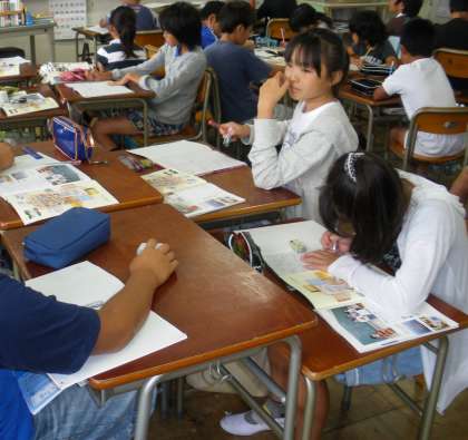 上:1組は社会で、「工業製品のふるさと」についてグループ学習しました。洋服のタグを見て、どこの国でつくられているかなどを調べました。