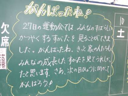 各クラスの背面黒板には、温かい呼びかけの言葉が書かれています。各担任の先生の思いが、子どもたちの心に響いていることと思います。