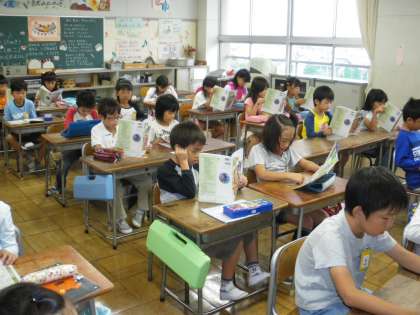 (左)1組は、「虫の声」を音階で歌ったり、鍵盤ハーモニカでみんなで吹いてみました。