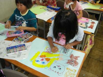 (中)2組は、物語の絵を本番の紙に描き始めました。