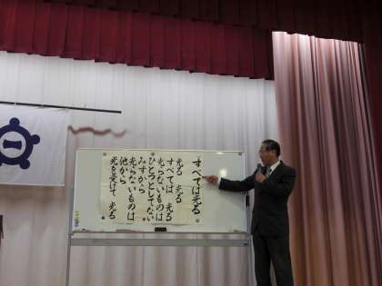 ところで、お正月に書初めをした人いますか。いますね。先生も書初めをしました。何と書いたでしょうか。これです。「すべては光る」です。