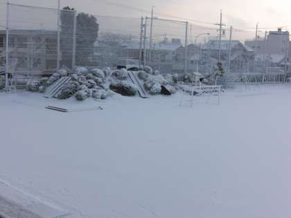 朝、突然の雪でした。登校時間に重なり、子どもたちは雪の中たいへんでした。校庭は、きれいな雪景色となりました。