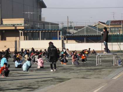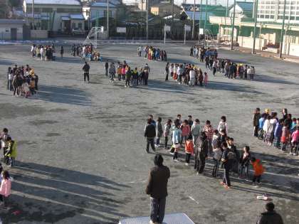 今日の向山タイムは体育朝礼です。1/27(水)に縦割り班で行われるなわとび大会にむけて、それぞれの班の場所の確認等を行いました。