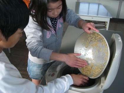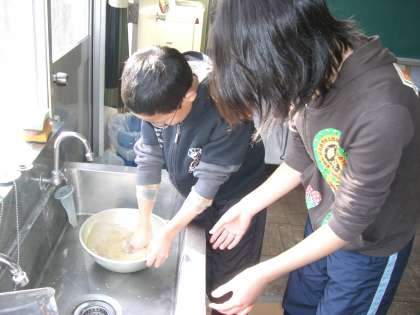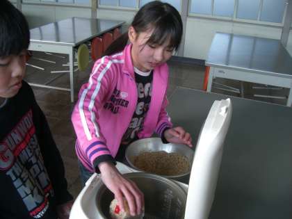 昨年、総合の時間で一生懸命育てた稲から取れた米を、玄米ご飯で食べるために家庭科室で米を洗い、明日の炊飯の準備をしました。