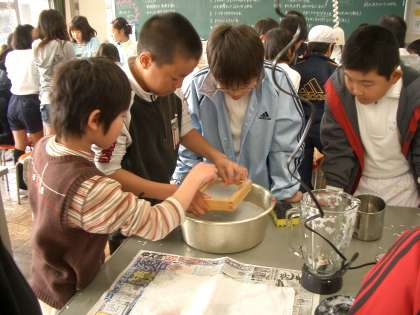 総合の学習で、紙が再利用できることを知るために、紙すき体験をしました。一人ひとり一枚ずつ紙すきを行い、それでしおりを作る予定です。