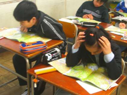 5−1:社会「私たちの国土と環境」 地図帳を使って地名探し競争をしました。人形峠・銚子・呉・横須賀など、みんなで一生懸命どこにあるか探しました。