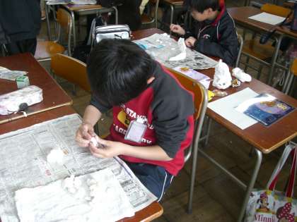 5−3:図工「光と影」 ピラミッドライトからきれいな光がもれでてくるようなオブジェを、紙粘土を使って試作しました。