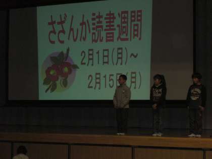 今朝は、児童集会が行われました。図書委員会の児童による読み聞かせと、来週から始まる読書週間の説明がありました。みんな楽しそうに聞いていました。