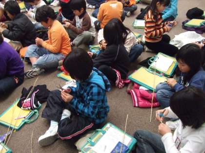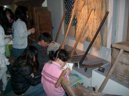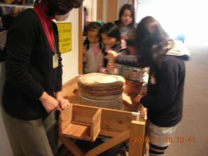 社会科で、昔の人のくらしについて学習しています。今日は一宮市博物館に見学に行きました。わらの刀を作ったり、石臼で粉をひいたりしました。今日学んだことは、新聞にまとめます。