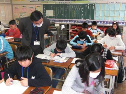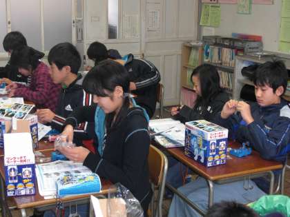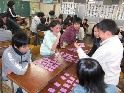 上:1組:国語で「百人一首」に挑戦しました。上の句を聞いて、さっと下の句を取ることのできた児童もいました。