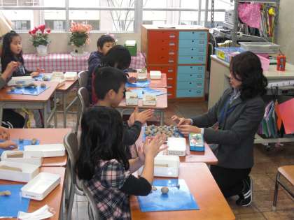 粘土で、球や円筒形などの形を作りました。手の平でころころ転がして、すべすべのきれいな球がたくさんできました。