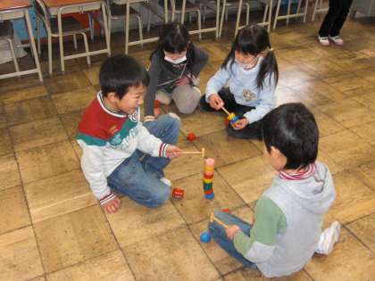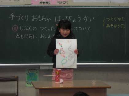 自分達で作った昔遊びの道具を、発表しました。作り方や遊び方を、友達に教えてあげました。けん玉、すごろく、コマなど、楽しい遊び道具がたくさんできました。