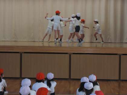 (上)体育:1組は、グループで遊園地の乗り物になりきり、皆の前で発表しました。