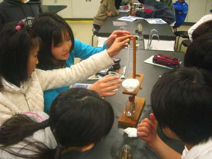 5−1:理科「もののとけかた」 熱して十分溶かしたホウ酸水から、ろうとをつかってホウ酸を取り出す実験をしました。1mlのろ液をアルコールランプで熱し、うまくホウ酸を取り出すことに成功しました。