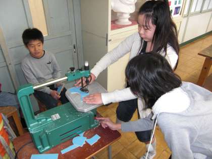 5−2:図工「板を切り抜いて」 電動糸のこで、板を切り抜く練習をしました。