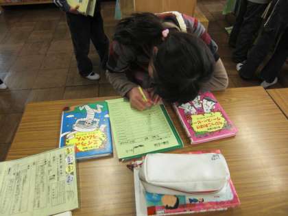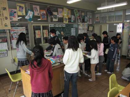 読書週間最終日の昼放課、図書館は読書する人、本を借りる人、読書郵便を書く人でにぎわっていました。みんな、本大好き!