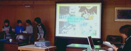 また、4名の代表者が、これまでに作製したグラフやエコ袋などを示しながら、今年度の取り組みの概要を説明しました。素晴らしい発表であるというお褒めのことばをいただきました。