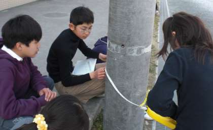 5−2:算数「円周と直径」 電柱やフラフープなど、身の回りから円の形をしたものを探して円周をはかり、その直径を求めました。