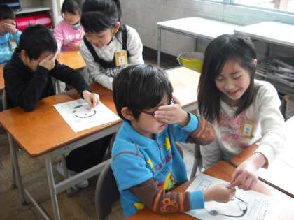 1組(上):オーエン先生の英語の時間に、上・下・右・左を英語で話し、ペアになって ふくわらいをしました。