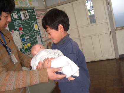 命のはじめは、針の穴ほどの大きさだったことを確認したり、赤ちゃん人形をだっこして大きさや重さを確認したりしました。