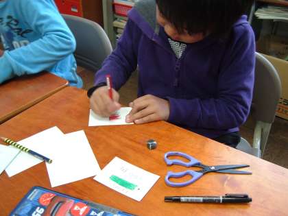 おかいものごっこの準備のため、品物のカードを作りました。おもいおもいのカードを作って楽しみました。