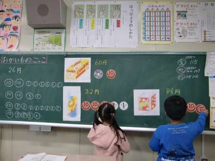 お買いもの遊びに向けて、お金の出し方の勉強をしました。ペアーで、お店屋さんになり、お金の模型を使って、練習しました。