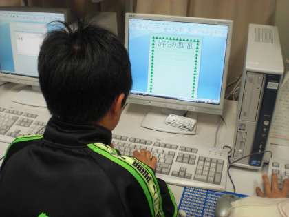 5年生では現在、総合的な学習の時間にパソコンの操作に慣れ親しんでいます。今日はパソコンを使って文書の作成にチャレンジしました。