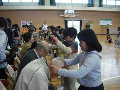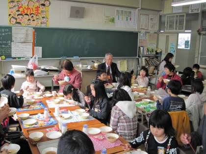 今日、いつもお世話になっている見守り隊の方を招待してお礼の会を開きました。一緒に歌を歌ったり、給食を食べたりと楽しい時間を過ごしました。