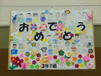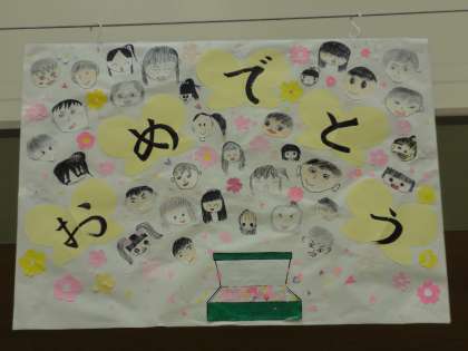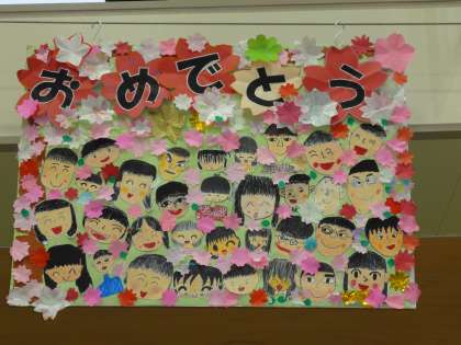 6年生を送る会にむけて、毎日歌や呼びかけの練習に、一生懸命取り組んでいます。おめでとうボードも完成しました。折り紙を切ったり貼ったりして飾り付け、心のこもったボードが出来上がりました。月曜日が楽しみです。