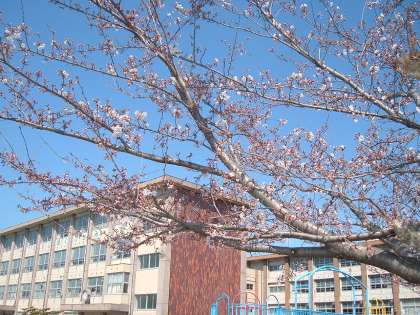 寒い日が続いていますが、校庭の桜が開き始めました。
