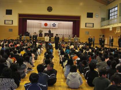 始業式では、校長先生から「新しい自分にバトンタッチしましょう」というお話がありました。その後、担任の先生の発表があり、全員で「よろしくお願いします」とあいさつしました。