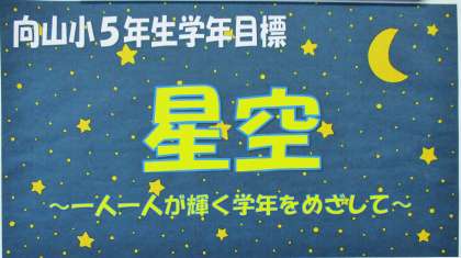 今年の5年生の学年目標は「星空」にしました。5年生になって、新しい教科が始まったり、委員会活動が始まったりするなど、高学年として多くの場面で活躍するみなさんが、「一人一人自信をもって輝ける存在になってほしい」という想いをこめて、この学年目標にしました。