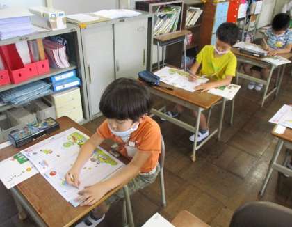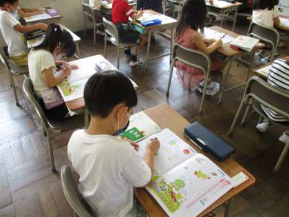 書写の授業が始まっています。担任の先生とは違う先生と一緒に勉強を頑張りました。