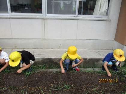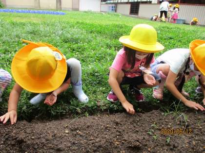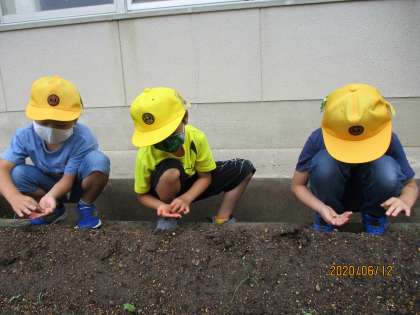 学年園に「ひまわり」「おくら」「ほうせんか」「マリーゴールド」の種を植えました。植える前には、種の観察をして、とっても小さな種やほうきのような種にわくわくしました。あさがおと一緒に、成長を観察していきたいと思います。