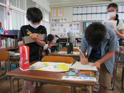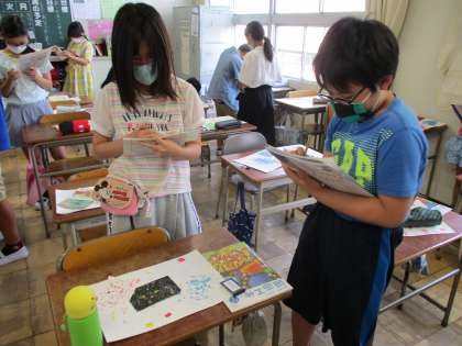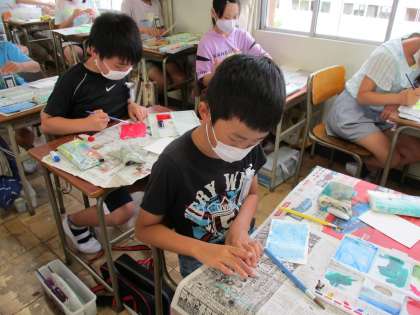 絵の具を使って、思いのままに表現することを楽しみました。5年生までに学んだ絵の具の使い方を思い出しながら、様々な心の模様をえがくことができました。また、その後は友達の作品のよいところを見つけて、次の作品にいかそうという姿が見られました。