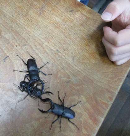 理科の授業で観察したり、放課には戦わせたりして、みんなでクワガタに親しんでいます。