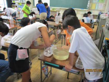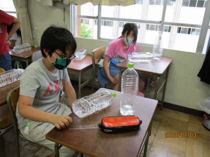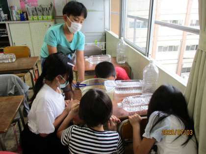 今日はご家庭で準備していただいたペットボトルを使った水槽にメダカを引っ越しさせました。子どもたちは理科の授業で学習したおすとめすの違いに気をつけながら、メダカを選んでいました。中には自分のメダカに名前をつけて、えさを与えるなど、生き物に対して愛情をもって接している姿も見られました。