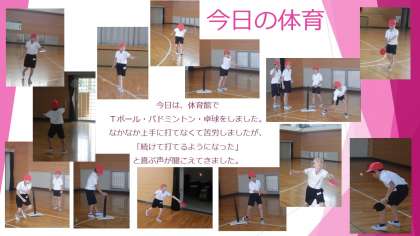 今日は、体育館でTボール・バドミントン・卓球をしました。