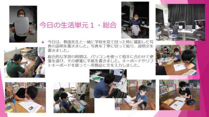 教頭先生と一緒に学校を見て回った時に撮影した写真の説明を書きました。写真を丁寧に切って貼り、説明文を書きました。